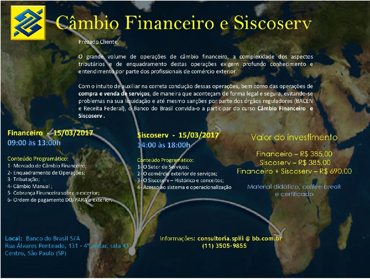 O Banco do Brasil irá promover o treinamento de Siscoserv no dia 15/03/2017 – Cambio Financeiro das 09h00 às 13h00 – SISCOSERV das 14h00 às 18h00, na Rua Álvares Penteado, 131 – 4º andar – Sala 41 – Centro – São Paulo/SP.