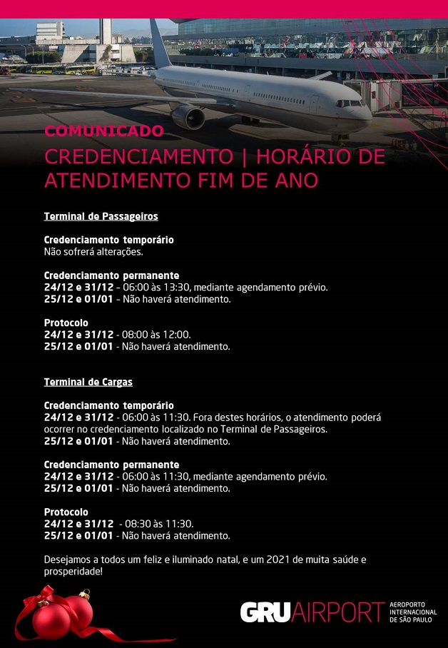 Encaminhamos comunicado da GRUAIRPORT sobre horário de atendimento fim de Ano.
