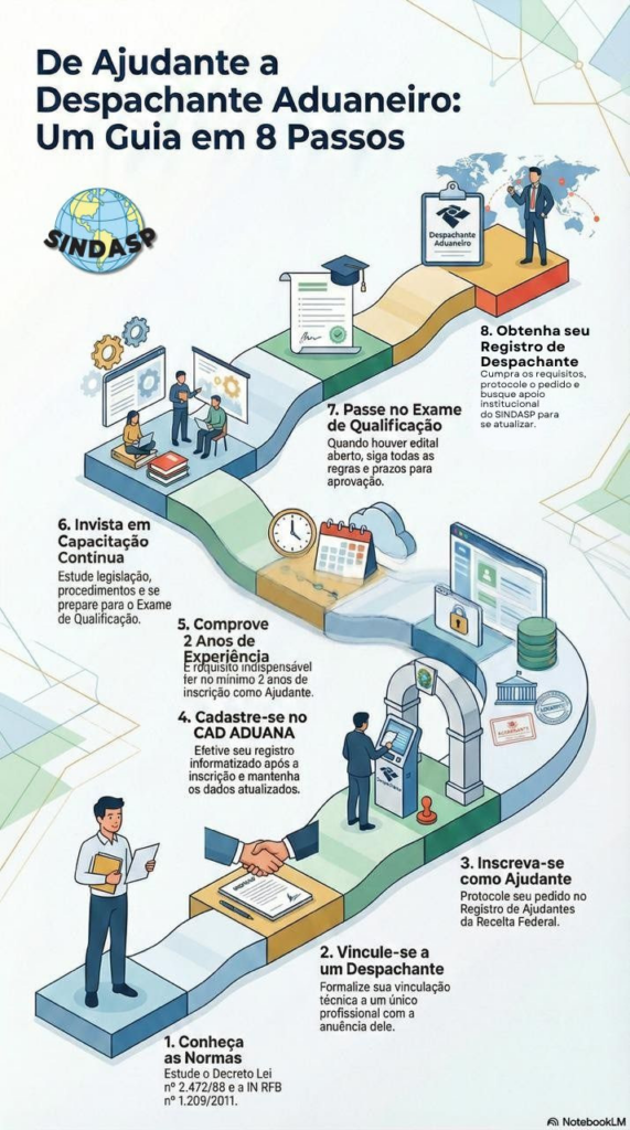Atento às demandas do mercado e ao interesse crescente de profissionais em ingressar e progredir na atividade de despacho aduaneiro, o SINDASP, Sindicato dos Despachantes Aduaneiros de São Paulo, maior entidade regional representativa da categoria no Brasil, apresenta este infográfico institucional para orientar, de forma técnica, clara e segura, o percurso do Ajudante até o registro como Despachante Aduaneiro, em conformidade com os requisitos e procedimentos da Receita Federal do Brasil.