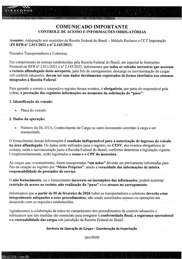 Acesso de veículos com cargas ao TECA Viracopos deverá ter dados registrados eletronicamente. Confira Comunicado do novo processo que poderá afetar “Puxe de Carga”