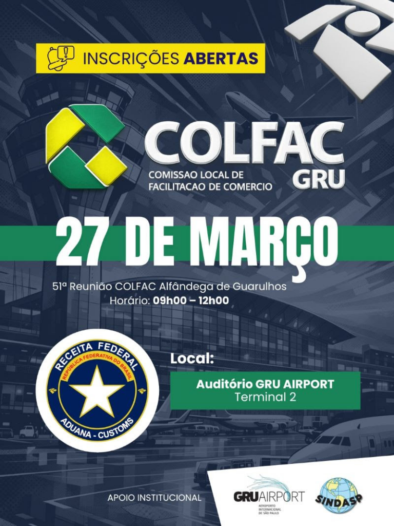 Atenção Despachantes Aduaneiros e Comunidade do Comércio Exterior. O link de inscrições para a 51ª Reunião Colfac Guarulhos já está disponível e as vagas presenciais costumam ser preenchidas rapidamente.