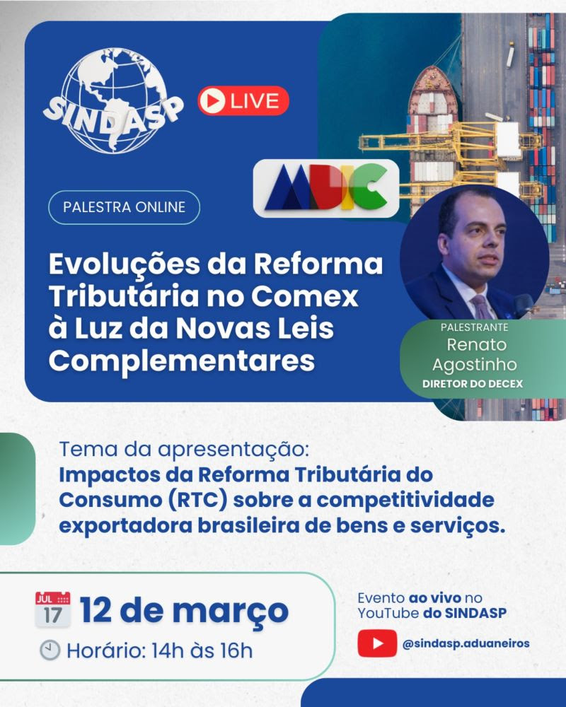 No próximo dia 12/03, das 14h às 16h, o SINDASP transmite no YouTube o Webinar “Evoluções da Reforma Tributária no Comex à Luz da Novas Leis Complementares”, ministrado por Dr. Renato Agostinho, Diretor do Departamento de Operações de Comércio Exterior do MDIC (DECEX).