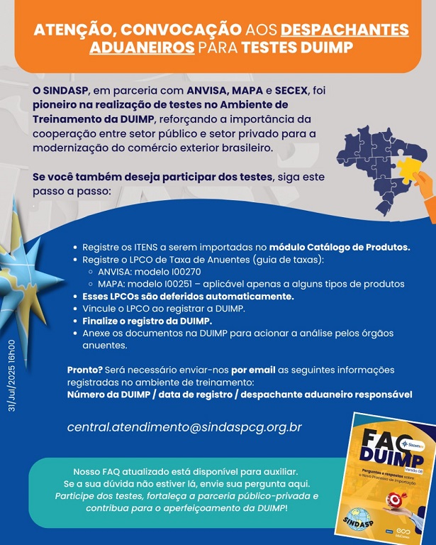 O SINDASP, em parceria com ANVISA, MAPA e SECEX, foi pioneiro nos testes no Ambiente de Treinamento da DUIMP, fortalecendo a parceria público-privada e contribuindo para a modernização do comércio exterior brasileiro.