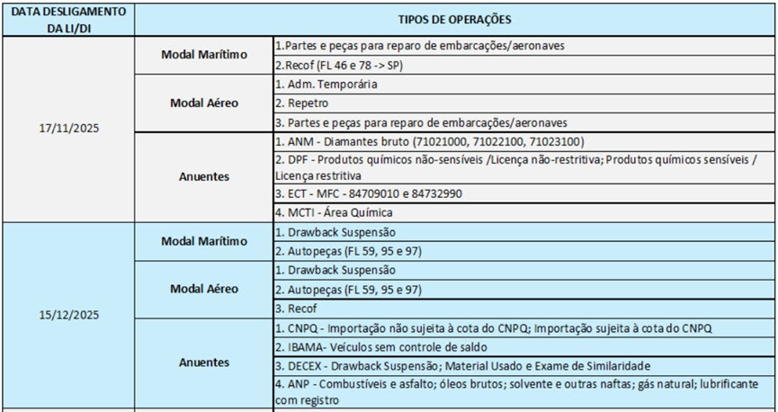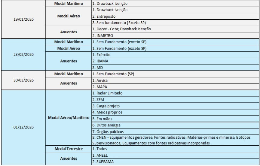 O cronograma abaixo reflete as datas a partir das quais será obrigatório registrar LPCO e Duimp nas operações de importação, caso a validação pelo setor privado não tenha indicado problemas sistêmicos impeditivos, conforme definido no Plano de Ação. Desta forma, será vedado ao importador, a partir de então, a possibilidade de continuar realizando essas operações por meio do Siscomex LI/DI.