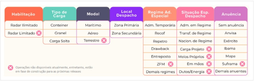 Atenção para as operações que ainda não estão disponíveis para registro de Duimp, cuja importação deverá ser efetuada por LI/DI. A figura abaixo destaca com o “X” as operações que não estão disponíveis para registro de Duimp: