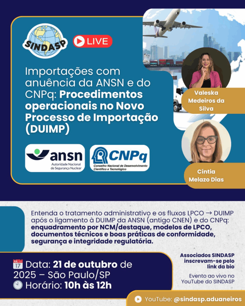 UH nº 232/25 – Evento online do SINDASP traz “Procedimentos operacionais nas importações de produtos sujeitos à anuência da ANSN e do CNPq no NPI”