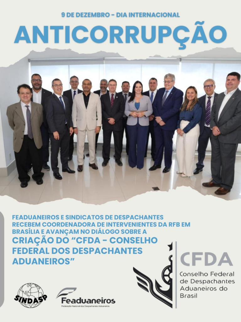 Ontem, 9 de dezembro, Dia Internacional Anticorrupção, líderes da Feaduaneiros (Federação Nacional dos Despachantes Aduaneiros) e dos sindicatos afiliados SDAERGS, SDAPRSC, SDAS, SINDACE, SINDAEES, SINDAEMG, SINDAERJ, SINDAM, SINDAPE e SINDASP estiveram na Subsecretaria de Administração Aduaneira (Suana/RFB), em Brasília/DF, para reafirmar o compromisso da categoria com a conformidade e a integridade das operações de comércio exterior e evoluir o diálogo institucional em torno da proposta de criação do conselho de classe profissional dos despachantes aduaneiros.